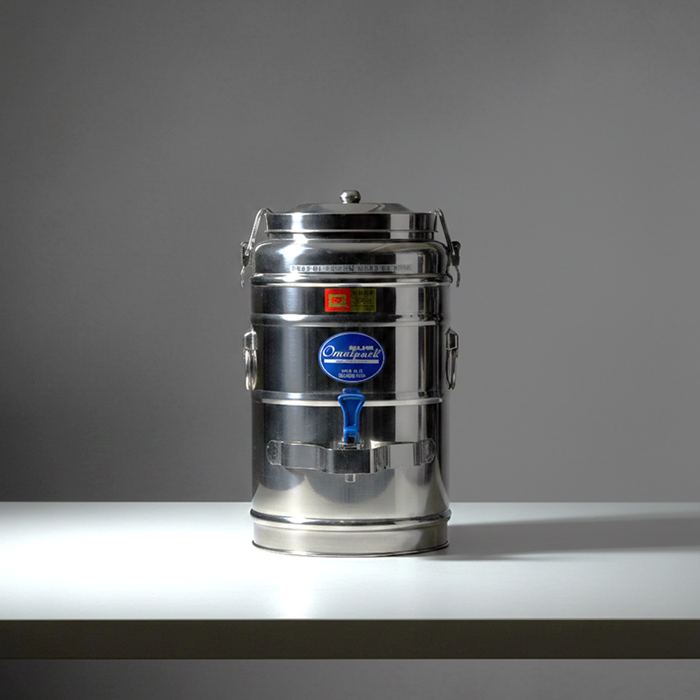식당, 뷔페, 행사장 등에서 대량의 물, 차, 음료를 뜨겁거나 차갑게 장시간 유지하는 대형 스테인리스 보온/보냉 용기입니다.