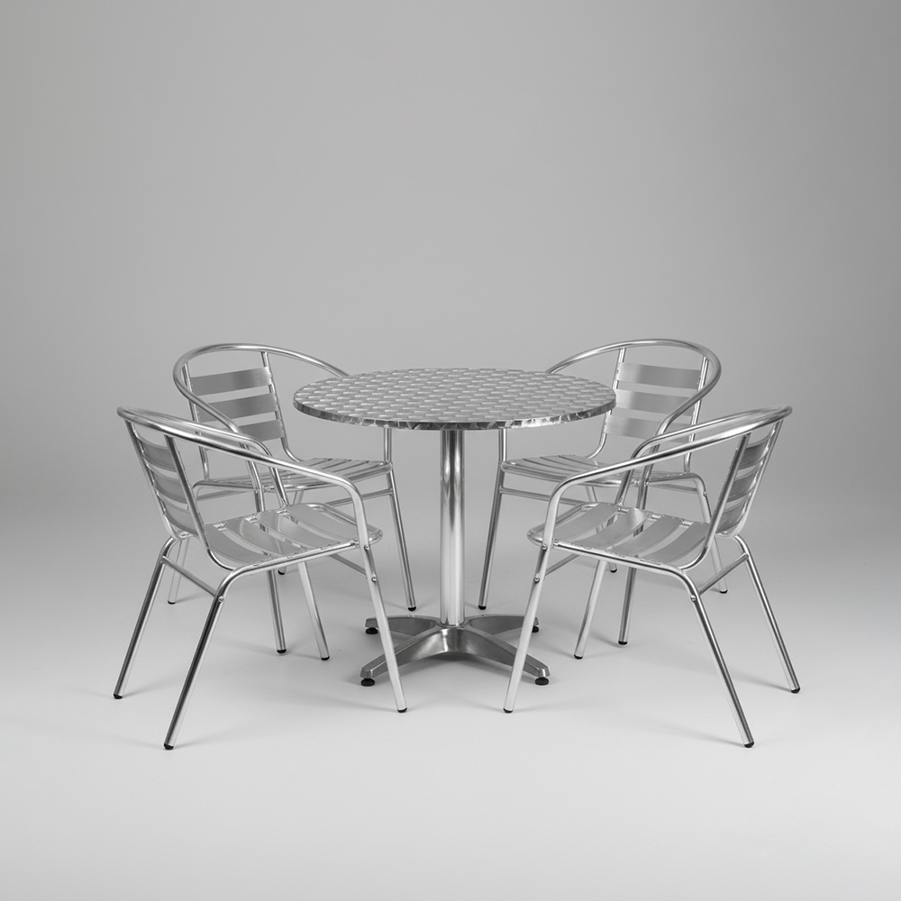 원형테이블(알루미늄) 하나와 알루미늄의자 4개로 구성되어있습니다.