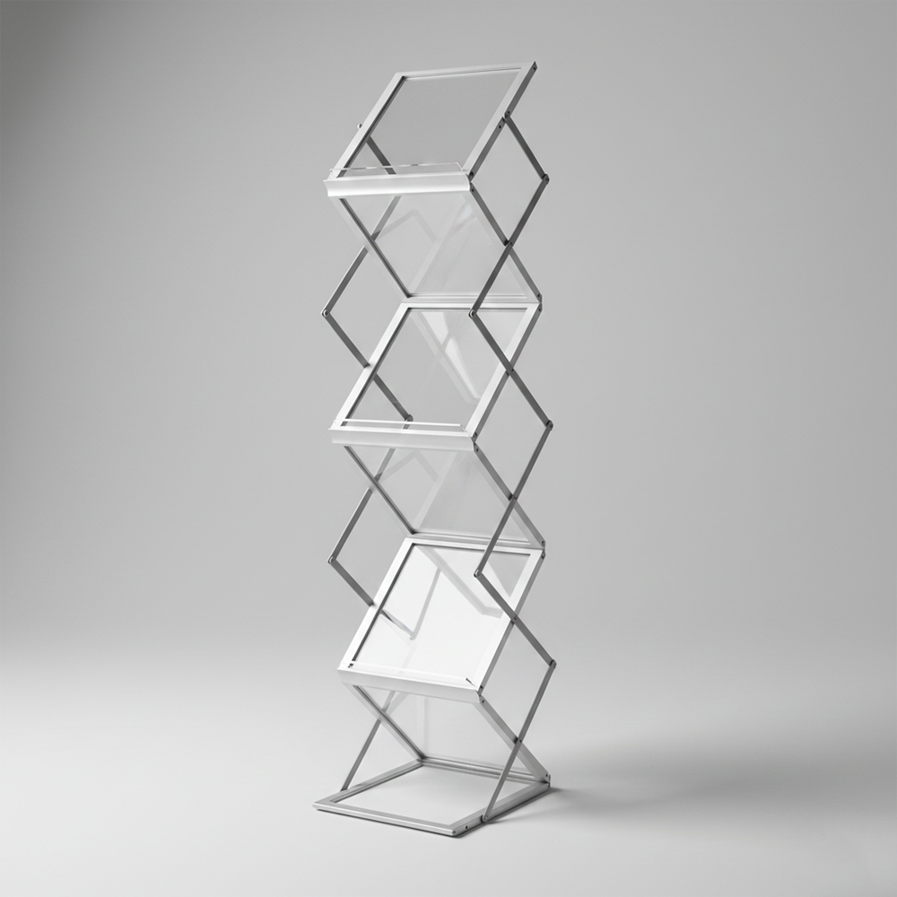 기업, 홍보물, 잡지, 리플렛 등 인쇄물을 전시하고 전달하기 위해 행사장, 박람회장, 사무실, 매장 등에서 사용하는 이동식 거치대입니다.