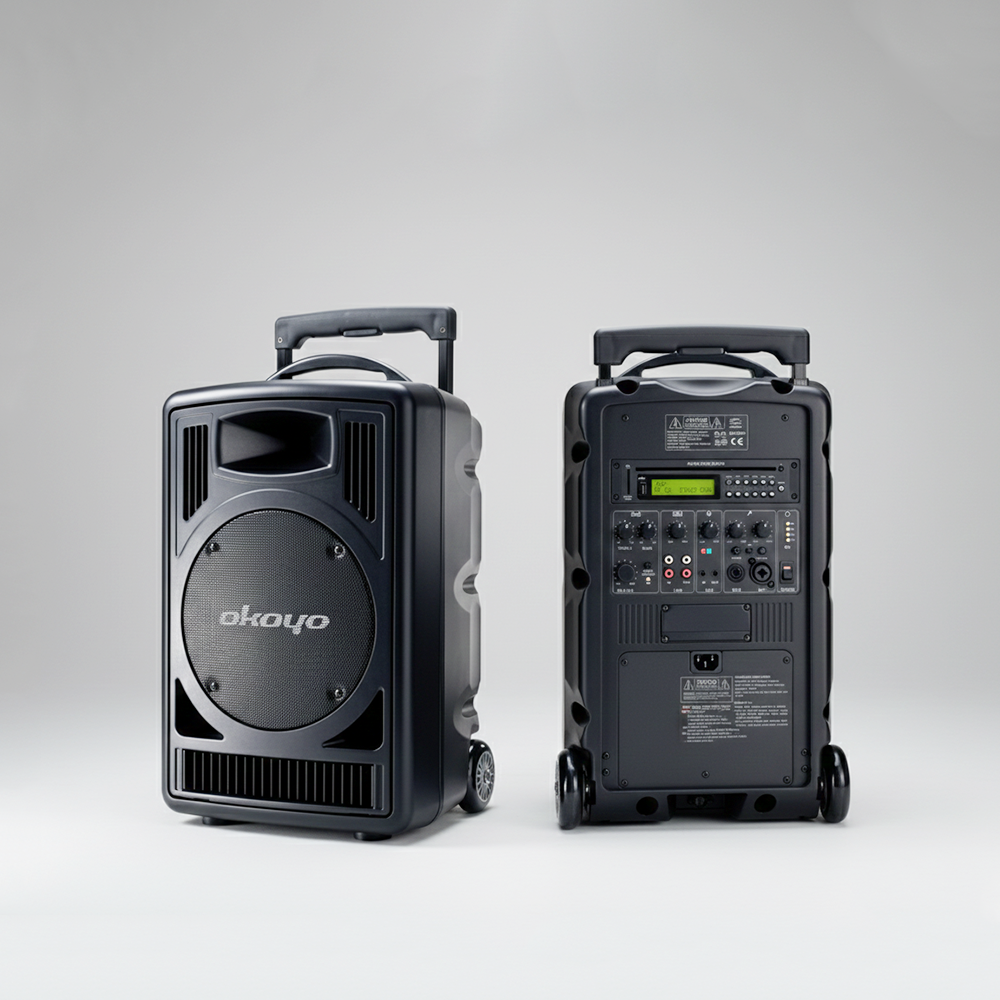 바퀴와 손잡이가 달려 여행용 가방(캐리어)처럼 끌고 다닐 수 있는 이동식 앰프 스피커 시스템입니다.